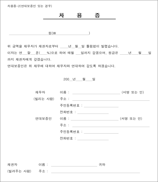 아래 링크를 통해 일반 차용증 양식과 연대보증인이 있는 경우에 따라 간편하게 사용할 수 있는 차용증 양식을 무료로 다운로드 받을 수 있습니다.